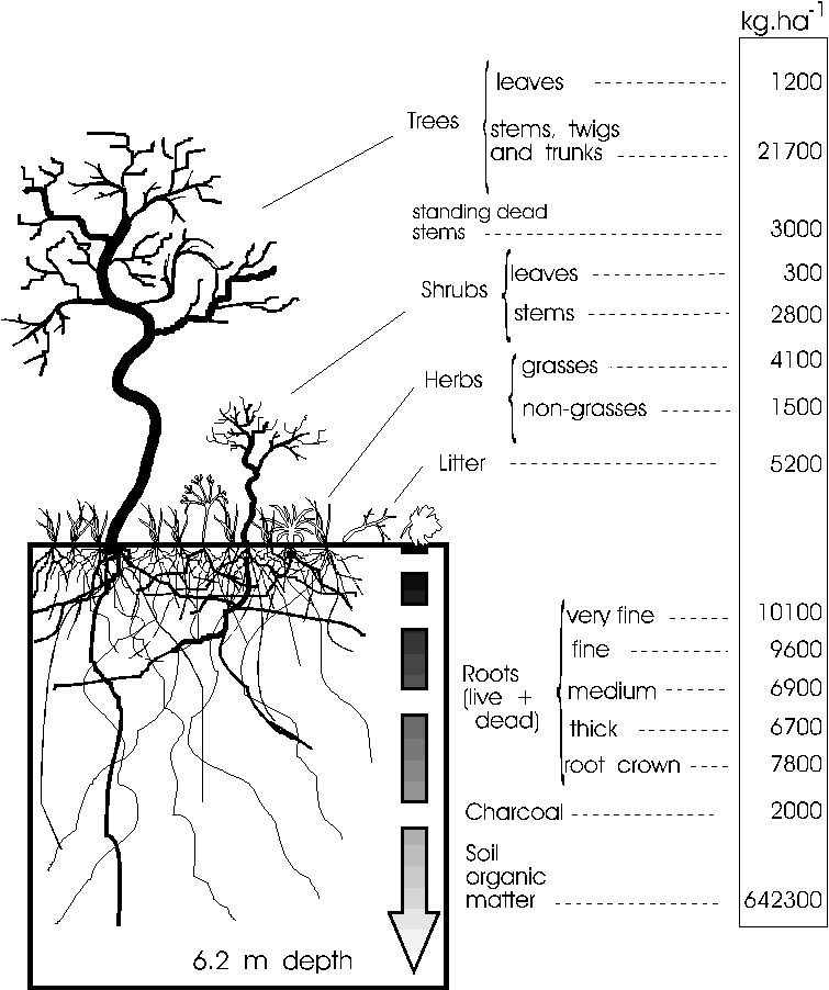 A summary of the distribution of organic material in the cerrado is presented in Figure 6. The total belowground biomass, excluding charcoal and soil organic matter, divided by the total aboveground biomass, including litter, presents a ratio very close to 1.