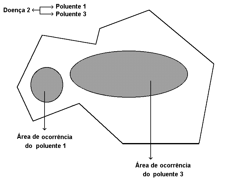 1) Primeiramente, através do SIG, pode-se lançar sobre um mesmo mapa básico de um município a área de influência (dispersão) dos poluentes, isoladamente. Obter-se-á, em consequência, tantos mapas temáticos de poluentes quantos poluentes conseguirmos levantar (Figura 4).