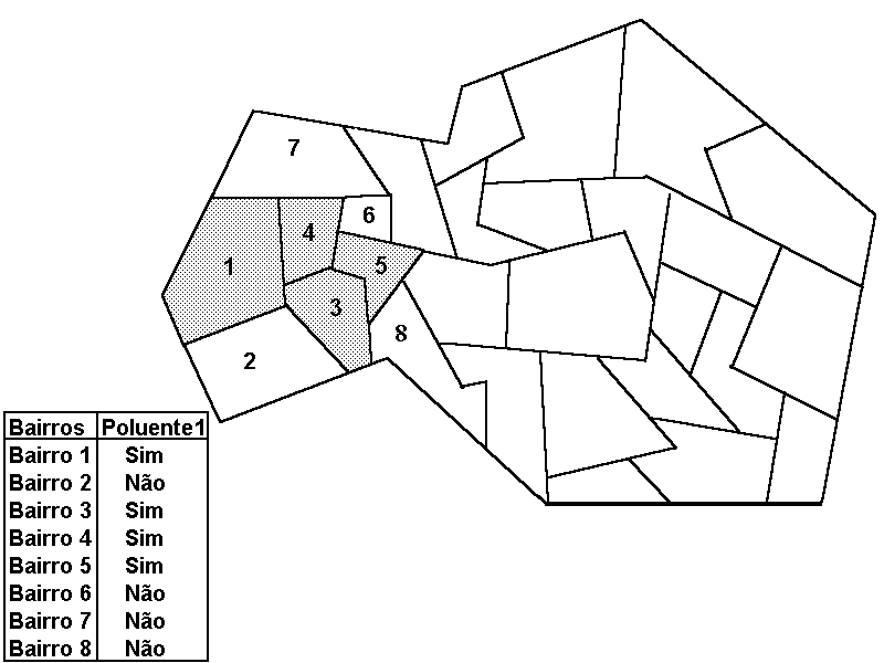 Desta forma, ao selecionar-se uma localização no mapa, o SIG indicará a feição em que se insere - sua tipologia - e, migrando para o Banco de Dados Alfanumérico, apresentar os poluentes ali presentes, suas características, doenças causadoras e outras informações lá contidas; ou então, os poluentes associados àquela legenda, suas características, e as indústrias emissoras naquele local. Pode-se percorrer o caminho inverso, selecionando-se no SGBD uma determinada doença (ou conjunto de doenças), ou um deteminado poluente (ou conjunto de poluentes) e obtendo-se os identificadores de todas as legendas associadas a estes valores para o atributo objeto de seleção. Após isto, pode-se migrar para o SIG e fazê-lo apresentar visualmente a ocorrência espacial desta(s) doença(s) ou deste(s) poluente(s) (Figura 8).