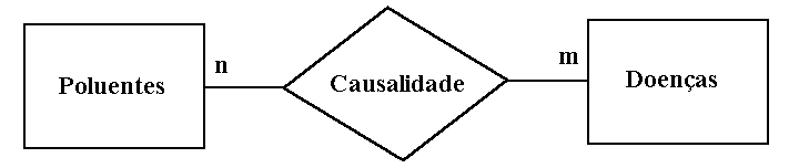 No caso de relacionarem-se diferentes doenças aos poluentes industriais, a forma de tabelas de informação se apresenta mais adequada para uma pesquisa inicial, pois a relação entre as duas entidades conceituais, poluente e doença, é característicamente múltipla, ou seja, de m para n (Figura 3). Um determinado poluente pode provocar mais de uma doença e uma certa doença pode ser provocada por diversos poluentes (Tabela 1).