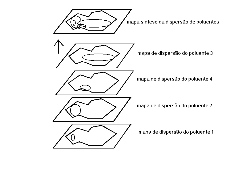 A confecção destes mapas é de responsabilidade do especialista em poluição, ou da conjugação de esforços deste com meteorologistas e/ou geomorfólogos, podendo a descarga ser atmosférica e/ou fluvial. É o conhecimento da natureza do poluente e suas formas de dispersão que permitem a delimitação das áreas sob sua influência, seja em círculos excêntricos de determinado raio ou em geometrias irregulares, cabendo ao sistema apenas a sua incorporação para fins de armazenamento e processamento junto com outras informações disponíveis. Na ilustração acima, as formas representadas hipoteticamente correspondem mais aos poluentes atmosféricos - sem considerar, neste caso, a ação dos ventos que deslocam o poluente em determinadas direções e sentido, e as resistências oferecidas pela topografia - ; caso fossem descargas líquidas, normalmente seguiriam o curso do rio a partir do ponto de lançamento, requerendo, como subsídio, o conhecimento da bacia hidrográfica. Portanto, as manchas (feições) de ocorrência do poluente serão diferenciadas de mapa para mapa, em função das características do poluente e da fonte de emissão (configuração da indústria e sua localização espacial).