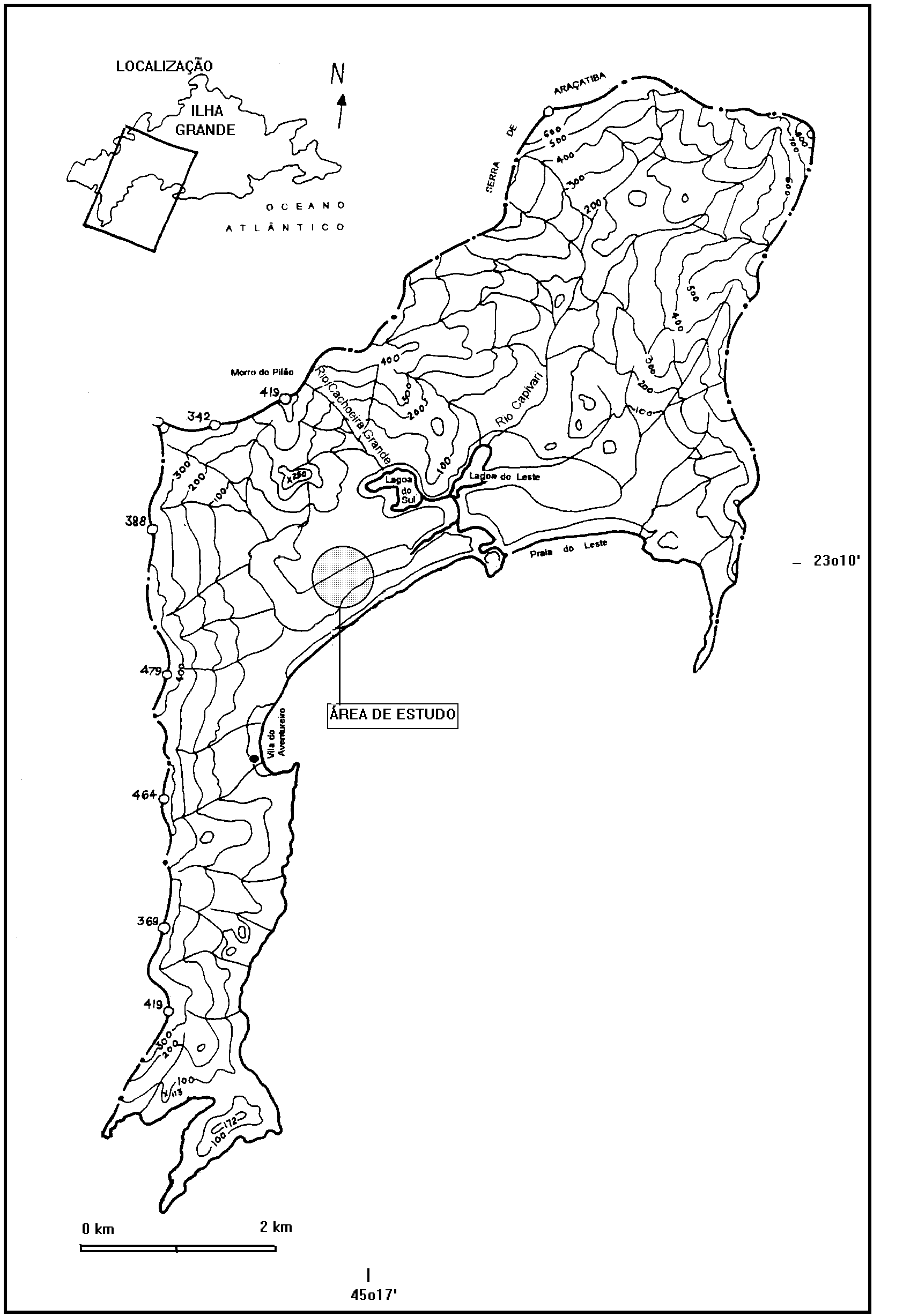 A área de estudo está localizada na Reserva Biológica Estadual da Praia do Sul (RBEPS), situada na vertente meridional da Ilha Grande, município de Angra dos Reis, Estado do Rio de Janeiro (23o 10'S; 44o 17'W) (Figura 1). A estação meteorológica mais próxima encontra-se no continente, na cidade de Angra dos Reis, a 20km em linha reta do local de estudo. A temperatura média anual desta é 22,6oC e a precipitação média anual é de 2.314mm (2). Nos meses de junho, julho e agosto ocorre uma redução da pluviosidade, não se verificando no entanto situações de déficit hídrico. Na área da Reserva, a média de altura pluviométrica entre os anos de 1993 e 1995 foi de 1.515mm (19). Os ventos são predominantemente dos quadrantes leste e sul.
