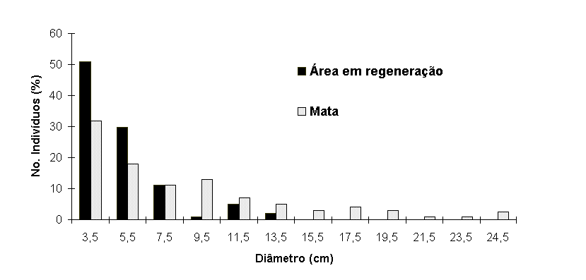 Figura 2. Histograma dos diâmetros (DAP ³ 2,5cm) dos indivíduos arbóreos na mata e na área em regeneração na planície arenosa da Reserva Biológica Estadual da Praia do Sul, Ilha Grande, RJ.