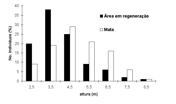 Histograma das alturas dos indivíduos arbóreos na mata e na área em regeneração na planície arenosa da Reserva Biológica Estadual da Praia do Sul, Ilha Grande, RJ.Neste estudo, Trema micrantha (L.) Blume e Aegiphila sellowiana Cham., que possuem baixa tolerância à sombra (6) englobaram 22,7% do VI total. O sucesso destas espécies na regeneração da mata de restinga em Saquarema pode ser atribuído à maior largura (20m) e orientação dos arruamentos feitos por trator. Enquanto na RBEPS a estrada está orientada na direção E-W, que recebe menos luminosidade (21), a maior parte dos arruamentos amostrados (62,5%) no estudo referido (24) estão orientados na direção N-S.