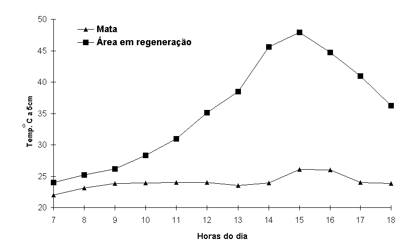A Figura 5 mostra os valores de temperatura do solo a 5cm tomados de hora em hora no dia 8/01/91. Enquanto que a temperatura na mata de restinga manteve-se em uma faixa de variação de 4,2oC, a da clareira atingiu uma variação de 24oC. O pico de temperatura alcançado no dia 8 de janeiro (48oC) deve ser ultrapassado em fevereiro, em que a temperatura do ar atinge os valores mais altos do ano. Esta variação de temperatura da clareira representa um fator de inibição de numerosos processos biológicos (27).