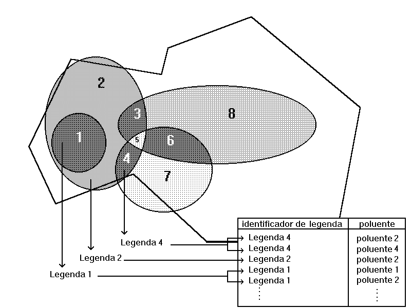 A confecção destes mapas é de responsabilidade do especialista em poluição, ou da conjugação de esforços deste com meteorologistas e/ou geomorfólogos, podendo a descarga ser atmosférica e/ou fluvial. É o conhecimento da natureza do poluente e suas formas de dispersão que permitem a delimitação das áreas sob sua influência, seja em círculos excêntricos de determinado raio ou em geometrias irregulares, cabendo ao sistema apenas a sua incorporação para fins de armazenamento e processamento junto com outras informações disponíveis. Na ilustração acima, as formas representadas hipoteticamente correspondem mais aos poluentes atmosféricos - sem considerar, neste caso, a ação dos ventos que deslocam o poluente em determinadas direções e sentido, e as resistências oferecidas pela topografia - ; caso fossem descargas líquidas, normalmente seguiriam o curso do rio a partir do ponto de lançamento, requerendo, como subsídio, o conhecimento da bacia hidrográfica. Portanto, as manchas (feições) de ocorrência do poluente serão diferenciadas de mapa para mapa, em função das características do poluente e da fonte de emissão (configuração da indústria e sua localização espacial).