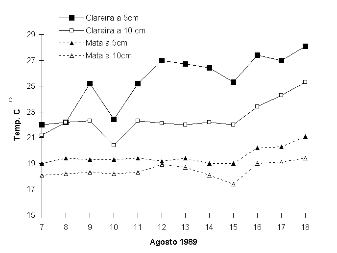 A Figura 4 apresenta dados de temperatura do solo a 5 e 10cm de profundidade na mata e na clareira, no período de 7 a 18 de agosto de 1989 às 14:00h. Deve-se destacar que o mês de agosto se caracteriza por temperaturas mais baixas e portanto as diferenças são menos significativas. A 10cm de profundidade, a variação entre as temperaturas do solo da mata e da clareira são menos intensas do que a 5cm. No entanto, é pouco representativa a diferença da temperatura do solo da mata entre 5 e 10cm. Isto pode ser atribuído ao papel do dossel da mata conservada que reduz as variações diuturnas sobre a superfície do solo.